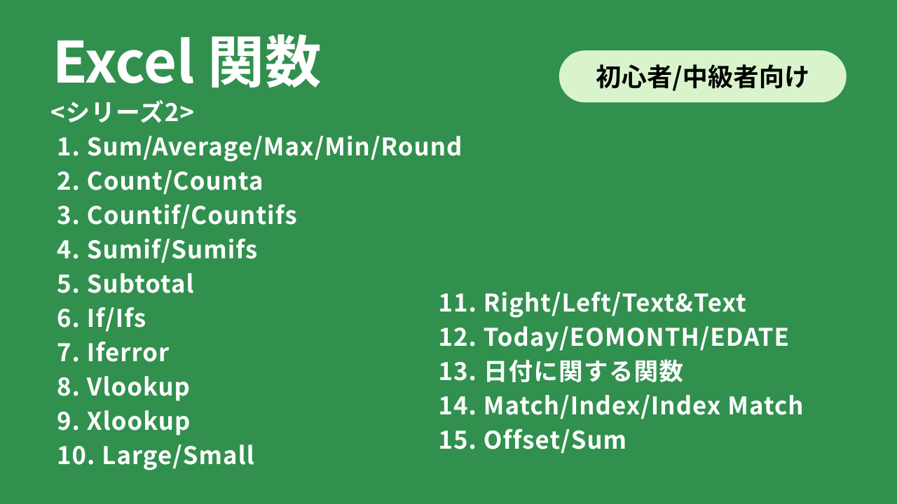 Excel ショート動画 – シリーズ2 Excel 関数 Excel ショート動画 - 練習ファイル X Facebook はてブ LINE コピー 2025.01.292025.08.17 Excel ショート動画 - 練習ファイル Excel 初心者・中級者向け ショート動画シリーズ2と練習ファイルです Excel ショート動画 シリーズ2 Excel 関数 excel_s2-1_Sum_Ave_Max_Min_Roundダウンロード excel_s2-2_Count_Countaダウンロード excel_s2-3_Countif_Countifsダウンロード excel_s2-4_Sumif_Sumifsダウンロード excel_s2-5_Subtotalダウンロード excel_s2-6_If_Ifsダウンロード excel_s2-7_Iferrorダウンロード excel_s2-8_Vlookupダウンロード excel_s2-9_Xlookupダウンロード excel_s2-10_Large_Smallダウンロード excel_s2-11_Right_Left_Textダウンロード excel_s2-12_Today_Eomonth_Edateダウンロード excel_s2-13_DateRelatedダウンロード excel_s2-14_Match_Index_IndexMatchダウンロード excel_s2-15_Offset_Sumダウンロード